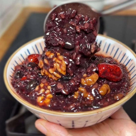 做法:先将黑米糯米红枣煮粥,煮熟时拌入芝麻核桃粉,加少许红糖(血糖高者可用代糖)。