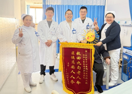 章奶奶在元旦前夕康复出院,家属亲手将“救回九旬老人命,医德高尚人人夸”的锦旗送到了医护人员手中。看着合影中章奶奶精神矍铄、温暖微笑的面庞,参与救治的医护人员心头感到欣慰温暖。