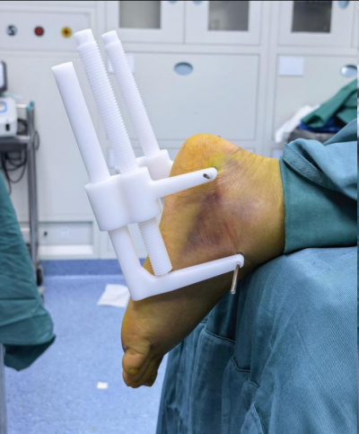 微创手术是外科发展的方向,但对于结构复杂的跟骨骨折,如何在最小创伤下实现精准复位,一直是临床上的挑战。“在手术中,清晰的视野是成功的关键条件。”廖雄介绍,正是源于多年临床一线工作中对这一痛点的深刻体会,激发了他创新的灵感。经过反复构思与验证,他成功研发出一种由高分子复合材料制成的轴向撑开系统。该器械经皮安装后,通过闭合撑开可迅速恢复跟骨的形态。而且在X光透视下几乎不显影,为医生提供了“零遮挡”的清晰手术视野,使经皮微创操作变得更为精准、安全。