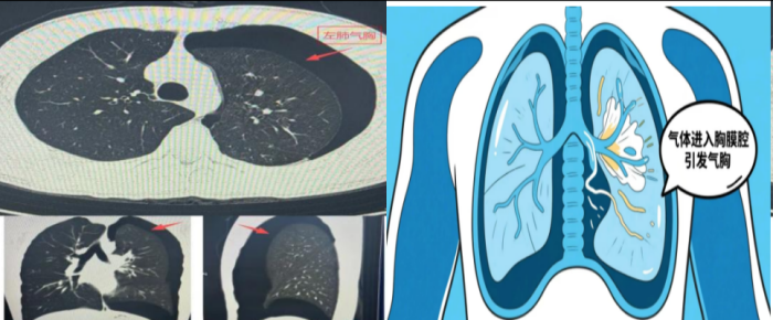 入院时,阳军呼吸困难症状持续加剧,血氧饱和度呈进行性下降,情况危急,高度怀疑气胸可能!急诊团队立即为其实施经口气管插管,启动有创呼吸机辅助通气,同时完善相关检查。接下来,胸部CT检查结果印证了患者发生了左侧气胸,肺组织压缩达60%,且左肺膨胀不全,这也是导致其呼吸困难的核心原因。急诊团队迅速为患者置入胸腔闭式引流管行胸腔排气减压,为肺部复张创造了关键条件,为进一步精准救治,阳军被紧急转入急诊重症监护室。