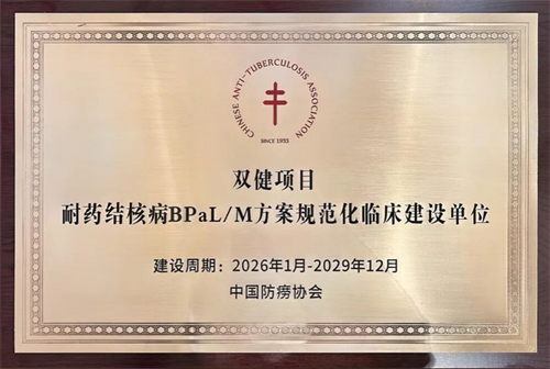凭借在结核病防治领域的深厚积淀、领先的临床诊疗能力与科研水平,被中国防痨协会正式授予“耐药结核病BPaL/M方案规范化临床建设单位”,成功入选全国首批“双健项目”建设单位。这标志着香港马会app