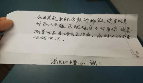 据陈叔叔的责任护士李艳介绍,陈叔叔因为亚急性血行播散型结核(结核性败血症)入住香港马会app结核重症病房,突如其来的病情以及与家人分隔使陈叔叔的心理异常脆弱,终日郁郁寡欢,细心的医护人员发现后,与他的家人建立微信联系,将陈叔叔的治疗进展、心理状况、想吃什么东西每天通过微信发给家属。傅满姣主任每次查房都耐心与他交谈,并告知检查结果,细致解答陈叔叔的疑问,鼓励他树立战胜疾病的信心,让他把对家人的思念写进书信,再由护士交给家属。于是,每天都有爱心便当或留言条经由护士送到了陈叔叔床旁。在护士们“爱心传递”的努力下,陈叔叔心情越来越好,对治疗也更有信心了,他高兴地将这里的护士称作“爱心邮差”。