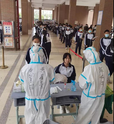 10月22日早上7:30,各组集结整装出发。其中一组队员负责幼儿园及小学,每人负责2000多个孩子的采样工作。“宝贝,头向后仰,嘴巴发出‘啊’的声音,真棒。”大家一边耐心引导着小朋友配合,一边敏捷地把采样棒伸入咽喉部进行采样。为配合小朋友的身高,队员们俯下腰,半蹲着身子一站就是一天。当采集完毕却发现自己腰无法直立,喉咙也已嘶哑。脱下防护服,清洁消毒后,队员们看到一个小朋友蹦蹦跳跳地朝队员们跑过来,害羞的把卡片递到了大家跟前,留下一句“谢谢你们”,就迅速地跑开了。打开卡片,看着上面歪歪斜斜的写着感谢的话语,可爱又贴心。”