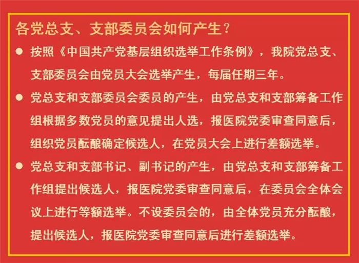 自2021年11月16日医院党委印发《基层党组织换届选举工作实施方案》以来,各党总支、支部选举工作筹备组按照文件选举程序要求陆续选举产生新一届党总支和支部委员会。截至12月29日,全院7个党总支、41个党支部均完成换届选举。