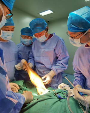 由于瘤体正好处于膝关节后,介入手术放置支架容易造成支架移位和折断,患者更适合通过血管外科手术方式达到切除动脉瘤和清除瘤腔中的血栓。赵扬程立刻执行多学科协作诊疗方案,邀请副院长、手足显微外科专家、主任医师刘鸣江,风湿免疫科罗徐医师讨论患者的手术方案。刘鸣江院长结合患者影像学检查,详细询问患者病情,仔细检查患者双下肢动脉搏动,浅表静脉走形,腘动脉瘤病灶等情况,同时考虑到患者体型偏瘦,双下肢浅表静脉细的特点,最终确定最优手术方案。