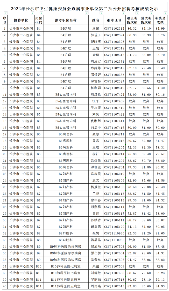 2022年长沙市卫生健康委员会直属事业单位第一批(第二批次)、第二批公开招聘考核成绩公示