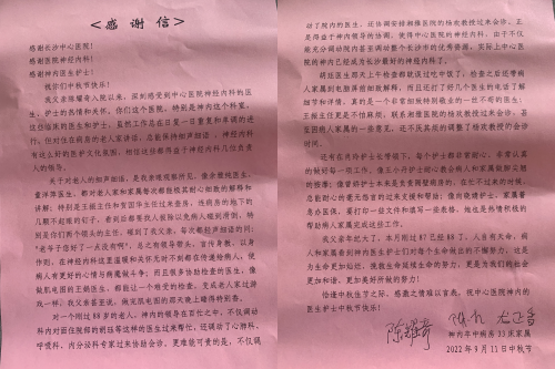 经过13天的治疗与康复,88岁的陈爷爷视力模糊的症状完全改善,并且能独自站立行走了。老人的儿子在感谢信中写道“人自有天命,病人和家属看到神内医生护士们对每个生命做出的不懈努力,这是为挽救生命延续生命的努力,更是为我们的社会更加和谐、更加美好做的努力!”