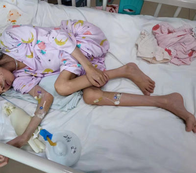 据孩子母亲王玉凤(化名)介绍,孩子在两年前就开始出现消瘦、乏力、食欲不振等症状,由于孩子父亲也很瘦,家里人都以为遗传了父亲的体型,并没有引起重视。没想到孩子越来越瘦,这两年个子长了,体重却不断下降,9岁体重仅13公斤,腹部却明显增大。一个月前,肖果在玩耍时意外出现摔倒后被送去当地医院检查,医生无意中发现孩子患有肺结核、肠结核,随后几天孩子出现反复发热、腹泻、腹痛。经当地医院抗结核治疗后,果果的症状稍有缓解。但出院没过多久后,肖果再次出现发热、腹泻、腹痛、腹胀、全背部疼痛难忍,只能每天躺在床上休息。