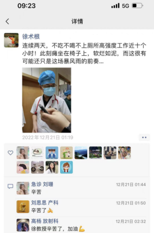在急诊科的医生工作站,呼吸与危重症医学科副主任刘达挂着氧气、头靠在墙上休息,刘达是2天前确诊新冠感染的,虽然发着高烧,胸闷乏力,但是她依旧每天出门诊。“呼吸科早就处于超负荷运转,科室的兄弟姐妹们都在带病上班,没人轻易下火线,门诊每天病人排长队,4个医生要看500多个号,这个时候每个人、每一份坚持都很重要。”她说。