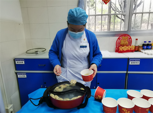 “王大爷,您胃口不好,这个饺子是白菜猪肉馅的,不油腻,今天过年,多吃几个!”副护士长刘群一边说着一边将一碗饺子送到33床王爷爷的手上,王爷爷今年70岁,因结肠癌入院,病情较重,不能回家过年,继续留在医院接受治疗。由于前段时间化疗药物的反应很重,使得他口腔溃疡,吃东西疼痛, 也没胃口,医护人员想方设法帮他解决痛苦,用维生素B12漱口水做口腔护理,协助他补充果汁、粥等清淡营养的饮食,医生也不断调整治疗方案,尽量减轻药物反应。“在这里住了十几天院了,肿瘤科的医生护士对我是真的很关心,每天查房、巡视、问候,有什么问题就马上帮忙解决,在这里过年一点也不孤单,热热闹闹的,挺好!”