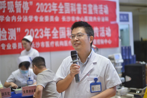 活动一开场,内分泌科副主任医师张贻宇就《血糖难控制?都是“打鼾”惹的祸—糖尿病合并阻塞性睡眠呼吸暂停》向现场群众介绍了什么是睡眠呼吸暂停、有何症状、糖尿病与睡眠呼吸暂停有何关系、有何危害。张贻宇建议有打鼾、白天嗜睡、肥胖、腹型肥胖、严重胰岛素抵抗、血糖变异度大、多囊卵巢综合征、顽固性难治性高血压、夜间心绞痛或有睡眠呼吸暂停家族史等的糖友要进行呼吸暂停疾病的筛查。张贻宇还告诉大家,糖尿病合并阻塞性睡眠呼吸暂停的患者经过持续正压通气治疗后能有效的改善胰岛素抵抗、降低糖化血红蛋白、降低空腹及餐后血糖、减少血糖波动、改善血压血脂等代谢指标。