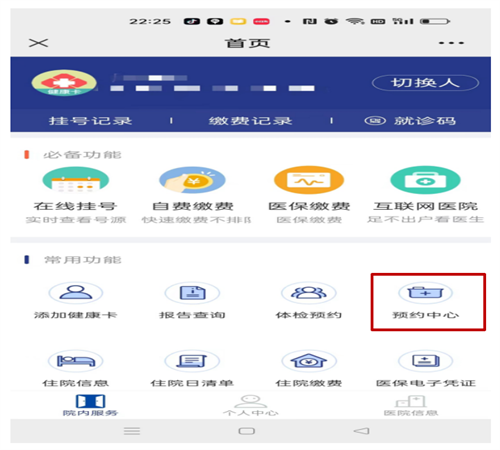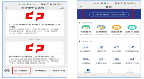 】微信公众号,点击【院内服务】,初诊患者【添加健康卡】