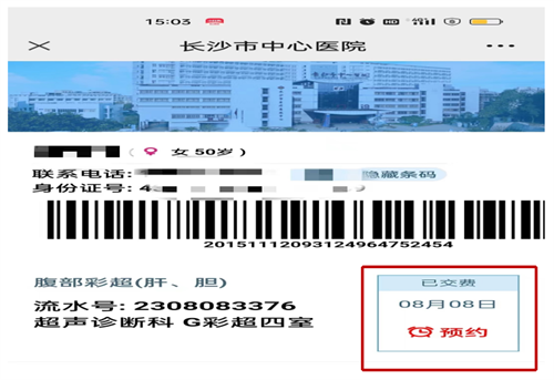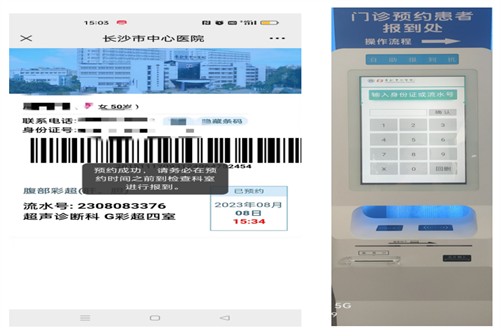 第七步:预约成功,请您在预约时间之前到超声检查科登记窗口对面的自助报到机上刷身份证或输就诊流水号报到。