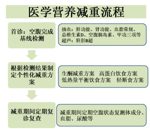 营养科开设医学营养减重门诊,主要是通过对减重者日常饮食的科学管理,并适当辅以抗阻运动来达到减重减脂,恢复健康体重的目的。减重方法包括生酮饮食、高蛋白饮食、轻断食以及低热卡平衡膳食等,根据体重管理者的日常饮食习惯制定符合个人饮食习惯的减重食谱,并随时调整,直至达到最佳减脂目的。为方便上班、上学人群中需要减重者,医院在周末也开设了医学营养减重门诊,因肥胖引起的脂肪肝、痛风、关节炎、多囊卵巢综合征及月经不规律、不易怀孕的人群都可以来咨询就诊。