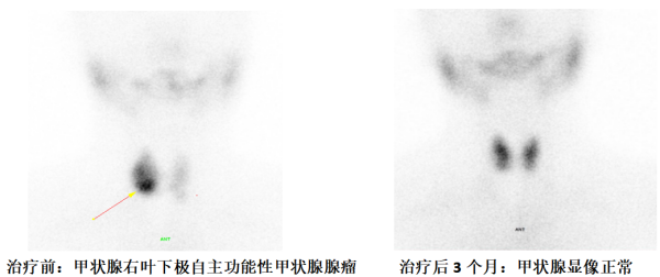 今年50岁的陈女士拿到结果非常担心,查询了网络资料后又怕结节是恶性肿瘤,一筹莫展之际,在朋友的推荐下至香港马会app甲状腺疾病碘-131治疗门诊看病,经过检查后,李赛春主任告知患者甲状腺结节是良性的自主功能性甲状腺腺瘤,甲亢也是源于这个腺瘤,通过碘-131治疗就可以解决这些困扰,经充分评估和完善相关检查后,予以碘-131治疗,1个月门诊复查,陈女士自诉吃饭也正常了,不再饿得慌,怕热、多汗、心慌这些症状全没有了,3个月门诊复查甲状腺功能及甲状腺显像恢复正常,目前陈女士已完全康复。