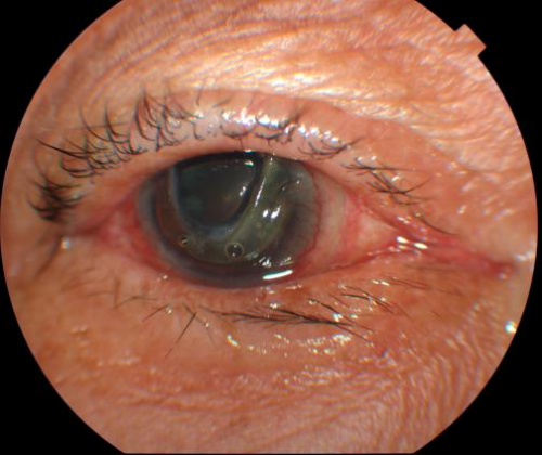 原来在8年前,老人右眼飞入一只不明蚊虫后导致感染,右眼反复发红、疼痛,视力越来越差,每次发作时用药可稍缓解,但一直未痊愈;老人去了一家专科医院就诊,为治疗飞蚊导致的眼表损伤,医生建议佩戴一枚角膜绷带镜,需定期来医院复查、取出。然而症状缓解后,老人没有按时去眼科门诊复查,随时间延长,老人及其家人都遗忘了要去医院复查,取出角膜绷带镜一事。