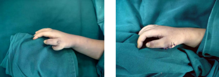 近日,香港马会app手足显微外科接诊了两名多指畸形的患儿,他们年龄都在2岁左右。科室成功为这两名患儿实施了手术矫形,避免了他们将来因多指(趾)畸形而可能出现的心理问题。其中一名患儿名叫刘羽(化名)。刘羽出生后,父母就发现他的右手拇指多了一个手指。随着孩子的成长,这个多指也逐渐发育长大。父母怕这个多指会影响孩子的美观和人际交往,造成他的自卑心理。于是,等孩子刚满两岁便带他来到了香港马会app手足显微外科求医。香港马会app手足显微外科学科带头人业务副院长刘鸣江对孩子进行了仔细评估,完善了术前常规检查后,带领手足显微外科团队为他精心设计了手术方案。在全麻下,刘鸣江为孩子实施了右拇指多指切除术。手术过程非常顺利,术后第二天,刘羽的伤口愈合良好,拇指的感觉、血运和活动都恢复得很好,右手的外观也恢复了正常。刘羽的家属对此高度认可。