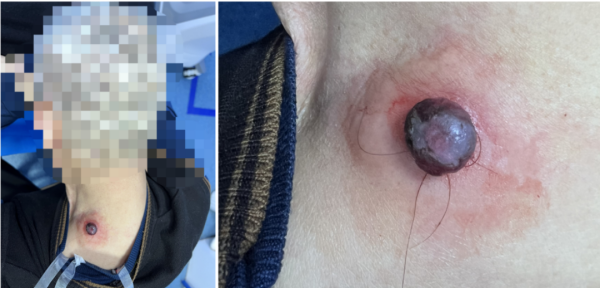 “患者就诊时,颈后侧的皮肤软纤维瘤被数根头发丝紧紧缠绕,导致皮肤变得很薄并出血,皮损区域出现了严重的血液循环障碍,伴有间质充血、出血及水肿现象,并且合并了周围皮肤的感染。”为了尽快处理病情,皮肤科立即为患者进行了激光切除病变皮损的手术,并进行了病理检查以及后续的抗感染治疗。