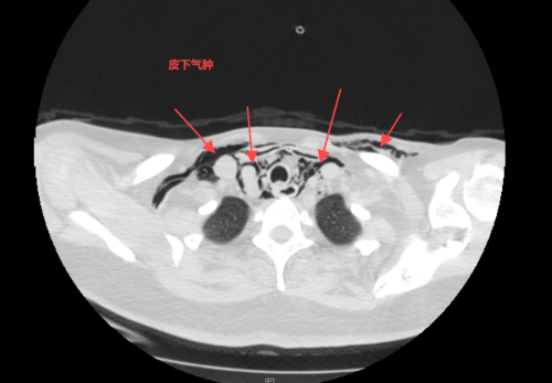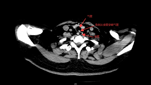 接诊的急诊科副主任、主任医师赫留党详细询问了她的经历,完善体查,发现李小华颈部及胸壁局部肿胀,考虑吞食异物导致食管破裂的可能,立马陪同患者完善了颈部及胸部CT,结果证实了之前的判断,影像学提示颈段食管异物,并气管、食管局部破裂,颈部皮下、纵膈及前胸部多发气肿。