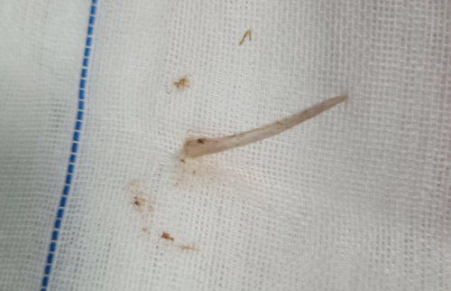耳鼻咽喉头颈外科团队紧急参与会诊,随后患者转入耳鼻咽喉头颈外科,完善术前准备后在全麻下行食管瘘修补+食管异物取出术。术中取出一根长约3厘米的条状粗大鱼刺。参与手术的耳鼻咽喉头颈外科副主任医师康晓明分析,李女士鱼刺卡喉后采取错误的方法吞咽饭团,致使鱼刺进一步扎入食管深处,随后穿透食管、气管后壁,引发食管气管瘘。所幸急诊科及耳鼻喉科医护团队联手救治,迅速作出准确的判断和决策,让患者转危为安。