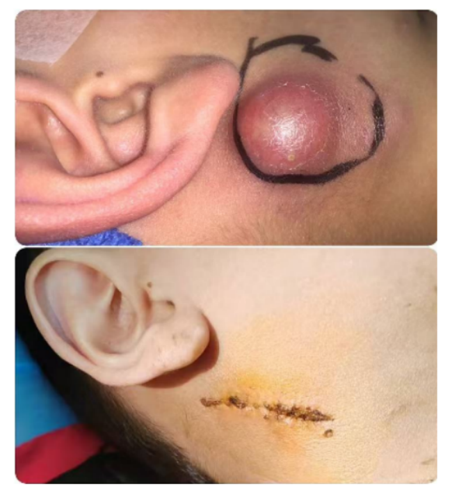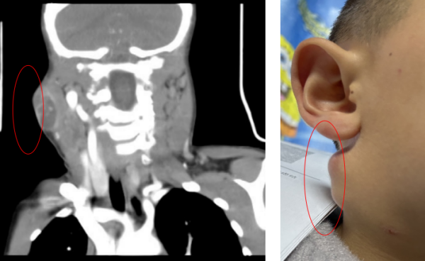 入院后,学生儿童结核科副主任周海依为孩子进行了仔细的检查,发现孩子颈部有多发淋巴结肿大,右下颌处有一直径约3CM的包块,表面红肿破溃,按压有波动感;左侧有三个包块,最大的直径为2.5CM左右。经过进一步完善检查,认为结核病诊断依据不足,联合耳鼻咽喉头颈外科副主任、主任医师周定刚会诊,明确有手术指征,转耳鼻咽喉头颈外科,完善术前准备后行双侧颌下淋巴结清扫术+皮瓣修整术。
