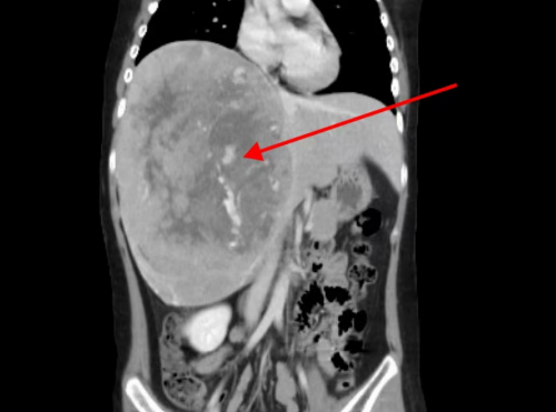 据该院急诊外科接诊医生王亮介绍,孩子入院时检查发现腹肌紧张,右上腹压痛,胸腹部增强CT提示:肝右叶肿块,考虑:肝母细胞瘤?合并肿瘤内出血。