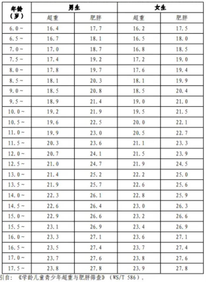 6-17岁儿童青少年:直接以BMI进行判定。家长需参照性别、年龄别BMI筛查超重与肥胖界值表(表2,具体数值略),以确定孩子的体重状况。