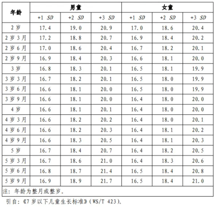 表1 2-5岁儿童年龄别BMI的标准差数值(kg/m2)