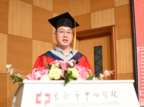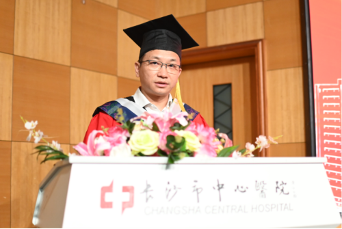 在雄壮的国歌声中,典礼正式拉开帷幕。院长陈智毅教授首先代表医院领导班子及全体教职员工,向圆满完成学业、即将踏上新征程的49名临床医学硕士研究生致以最热烈的祝贺!向为同学们成长倾注满腔热忱与智慧的全体导师,以及始终在背后默默付出、鼎力支持的家人朋友们,致以最崇高的敬意和最衷心的感谢!陈智毅院长深情寄语全体毕业生,提出了三点殷切期望:永葆“如履薄冰”的敬畏之心以严谨的态度对待医学事业;传递“厚德精医”的仁爱之火,用仁心仁术温暖每一位患者;坚守“敢为人先”的开拓之志,在医学的广阔天地中不断追求卓越。陈院长强调,这三点既是医院精神的传承,也是中心医院人应有的品格,希望毕业生们铭记于心,践行于行。