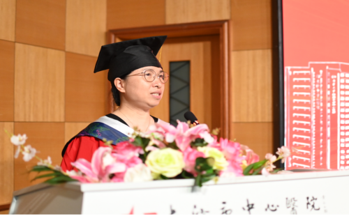 典礼上,2025届研究生代表尹洁同学发表了真挚感言。她深情回顾了在中心医院度过的宝贵时光,衷心感谢医院提供的广阔平台和丰富资源,感恩导师们如春风化雨般的悉心教导与无私关怀,并对同窗三年的深厚情谊表达了深深的眷恋。现场还播放了毕业生代表们提前录制的感恩视频,一句句发自肺腑的话语,传递着对导师们无尽的感激与崇高的敬意。