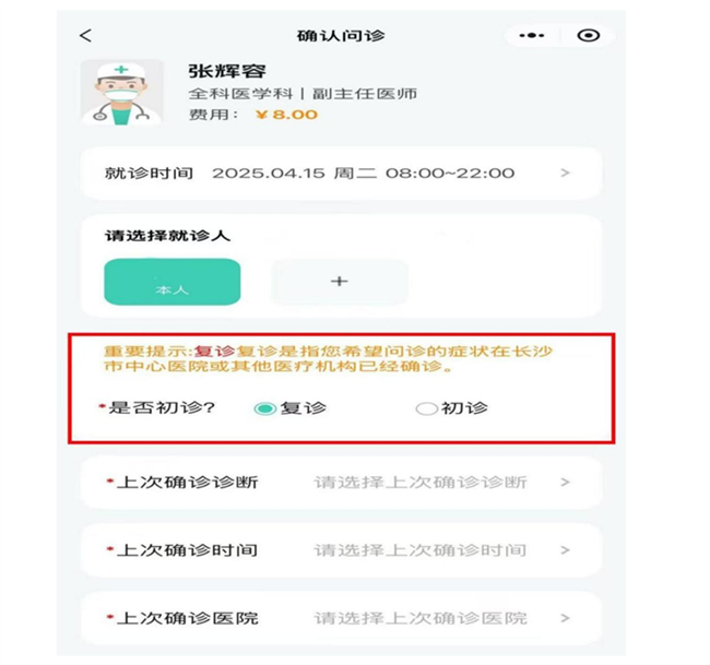 4. 选择或新增就诊人,对病情进行描述、上传病情资料,初诊患者仅限在线咨询问诊,复诊患者可根据病历资料开处方检验检查项目。