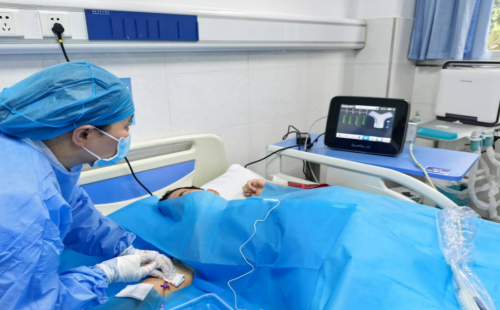 操作过程中,置管者可同步通过显示屏直观观察导管走向,动态调整路径,大幅提升了一次性置管成功率,同时有效规避了传统盲穿或超声引导的误差风险,为患者提供了高效精准的置管体验。该技术适用于血管条件差、凝血功能障碍或需反复置管的患者,其零辐射、高精准、可视化的特点,能最大限度降低并发症风险,提升患者就医体验,尤其对于危重症患者,该技术的使用能快速为患者搭建生命通道及时接受治疗,降低药物外渗风险。