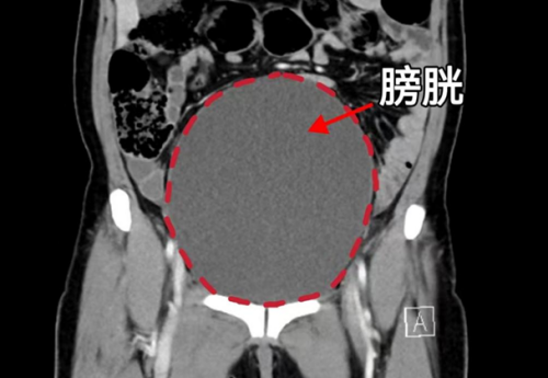 CT显示膀胱高度膨胀、尿道梗阻
