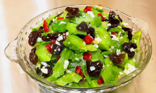 食材有苦瓜、洋葱、木耳、蒜末、小米椒、白芝麻、花椒等。制作方法如下:苦瓜去瓤切片,用盐腌制;木耳泡发后焯熟。热油爆香花椒,再将热油淋入装有蒜末、小米椒等调料的碗中,接着加入盐、糖、生抽、香醋、香油拌匀成酱汁。将苦瓜(焯水1分钟)、木耳、洋葱丝混合,淋入酱汁即可。