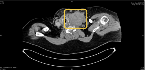 “患者体重达200余斤,1周前无明显诱因逐渐出现活动后呼吸困难,症状持续加重,入院时全身发绀、点头样呼吸、大汗淋漓,脉搏达165次/分(正常为60—100次/分),呼吸达31次/分(正常为12—20次/分),血氧饱和度降低、二氧化碳分压增高,白细胞远高于正常值。”在体格检查时,医生发现患者颈部存在一个较大肿块,CT检查显示,其左颈部至左锁骨上区有一个约10×9cm的巨大包块,气管后方也有一个4.4×4cm的巨大包块,两个包块严重压迫气道、影响呼吸。