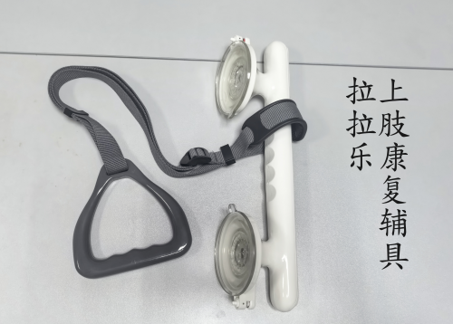 22床患者袁正刚(化名)正在康复医学科护士长瞿丹丹的指导下,使用本次辅助器设计大赛的其中一组参赛作品《上肢康复辅具:拉拉乐》。瞿丹丹介绍,这款训练器是为脊髓损伤及偏瘫患者设计的,这些患者无法自行起床,同时上肢力量有限。该训练器由一个拉环和一个强力吸盘组成,两个为一组,可以吸附于患者躺卧的病床床头,患者双手握住拉环,进行上举、外展、内收等动作训练,加强上肢力量,提高日常生活活动能力。瞿丹丹表示,22床患者因为下肢静脉血栓,暂时无法离床参加康复训练,训练器正好补充了上肢康复训练,患者不仅能够锻炼手部力量,还能依靠上拉的力量进行坐起。