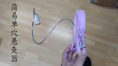 针灸室内,康复医学科副主任、副主任医师王井泉正在使用另一组参赛作品《简易单穴悬灸器》为病人进行灸疗。王井泉介绍,设计这款简易单穴悬灸器的初衷是因为人体某些特定穴位如百会、涌泉、翳风等,在传统艾灸盒难以直接应用的情况下,需要进行人工一对一悬灸,相当耗费人力。于是从适应性和安全性出发进行了创造设计,该悬灸器由三部分组成:大型晒衣夹、可塑型铝丝和艾条。大型晒衣夹用于固定在肢体、红外线灯架或治疗床板上,可塑形铝丝用于灵活调节以对准不同穴位,以及艾条端用于燃烧艾条产生疗效。通过这种简单的组合,实现了对特定穴位的精确施灸,成本较低,具有极高的性价比。