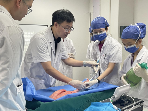 培训过程中,刘松华详细讲解了呼吸道的解剖知识及双腔支气管导管如何使用,刘永贤进行了可视双腔气管插管的示范教学。随后,由刘松华全程辅助教学,每位学员依次训练实操。为达到培训效果,最后每位学员都要单独进行双腔气管插管的演练,两位指导老师场外辅导。